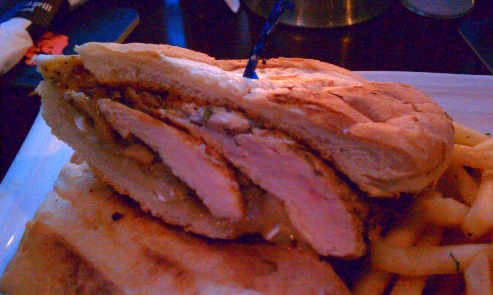 I finally decided on the Pressed Sandwich: a grilled chicken sandwich, with Brie cheese, caramelized onions, and sauteed mushrooms all stuffed into a french roll.