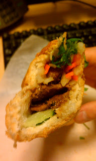 […] pork belly is lemongrass braised, with cilanto, cabbage, umami mayo, Asian Salsa Verde, pickled carrot and daikon all on a French Baguette. The pork belly was thinly sliced which allowed it not to suffer from […]