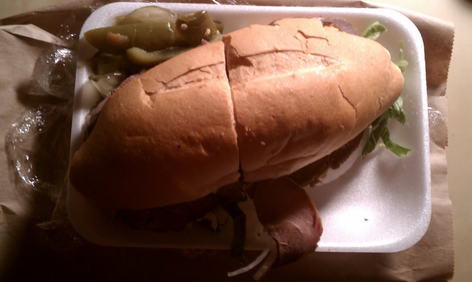 I had the gents at the counter pile on the warm sliced leg of lamb on top of a baguette with mustard, mayo, lettuce, tomatoes, pickles, jalapeños and onions. I wasn’t too sure about the mustard and mayo at first, but I did insist the guys pile on the works, and they assured me it would taste good.