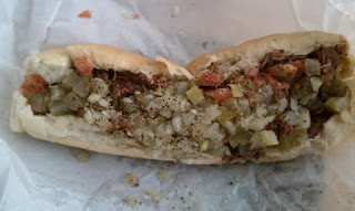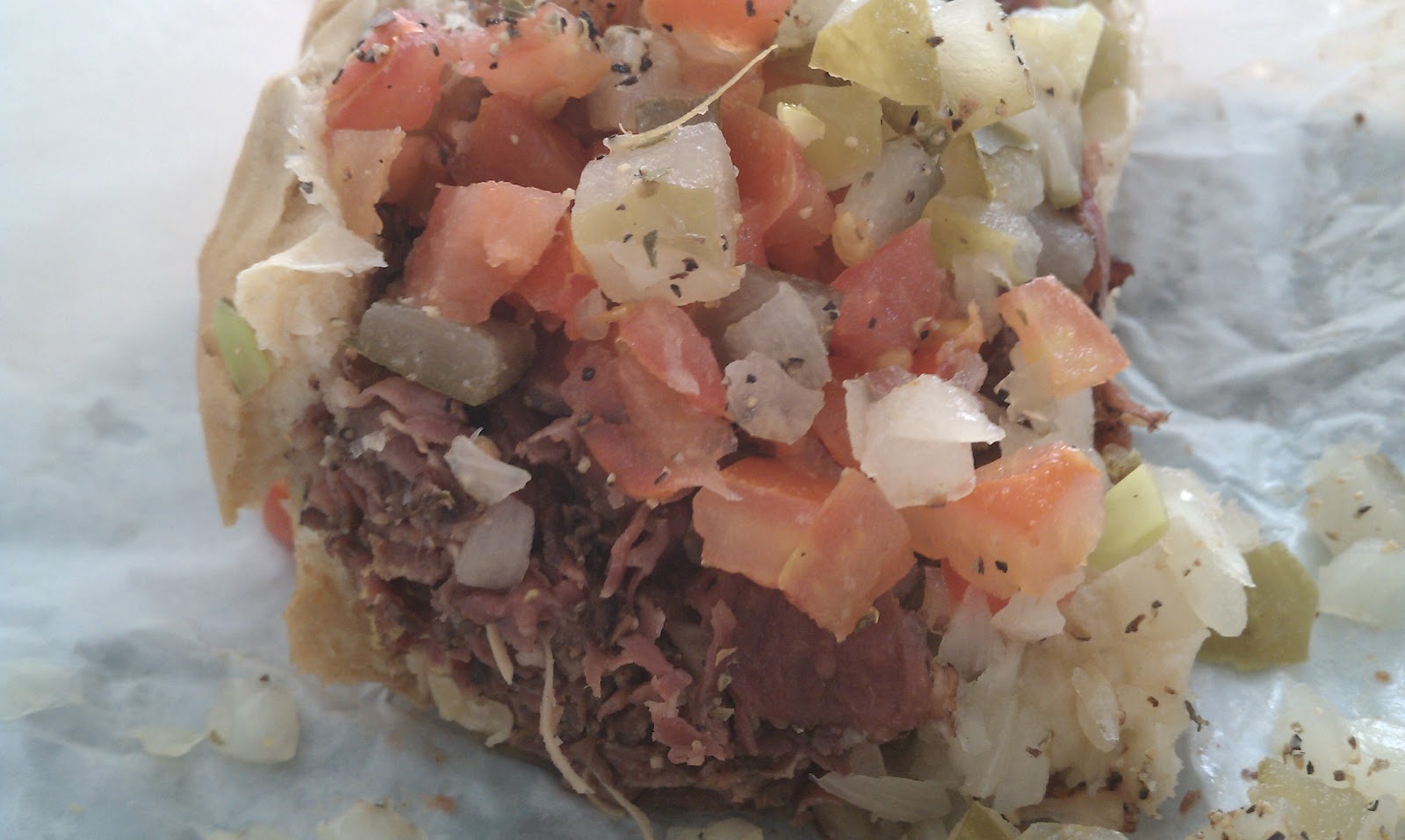 On top of the pastrami was a little bit of mustard, chopped tomatoes, onions, peppers, pickles, salt and pepper.